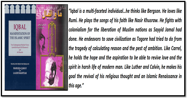Describing the persona and message of Iqbal, Dr Shariati writes, “Iqbal is a multi-faceted individual…he thinks like Bergson. He loves like Rumi. He plays the songs of his faith like Nasir Khusraw. He fights with colonialism for the liberation of Muslim nations as Sayyid Jamal had done. He endeavors to save civilization as Tagore had tried to do from the tragedy of calculating reason and the pest of ambition. Like Carrel, he holds the hope and the aspiration to be able to revive love and the spirit in harsh life of modern man. Like Luther and Calvin, he makes his goal the revival of his religious thought and an Islamic Renaissance in this age.”