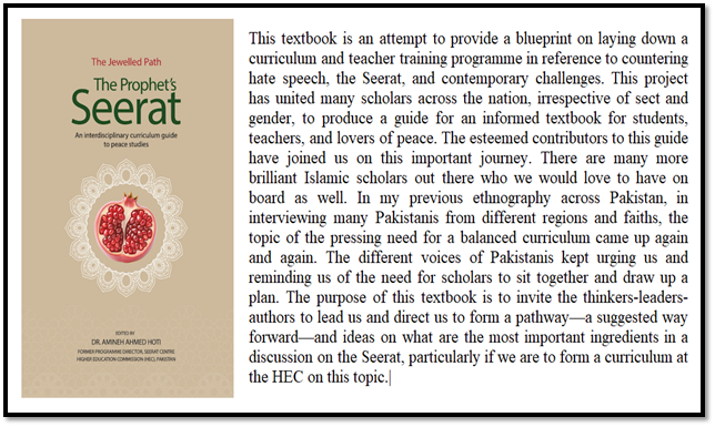 The editor further observes: “With this in mind, the Higher Education Commission, or HEC, has launched the Seerat Centre, which is dedicated to modernizing the education system of Pakistan to be able to address and deal with these contemporary challenges in the light of the Seerat. Initiated in 2014 by the Government of Pakistan, the Seerat Chairs Project has identified nine contemporary challenges and aims to set heads of chairs for each area of focus to oversee curriculum revision, teacher training, research, and dissemination of knowledge. As director of the project, I have, therefore, requested scholars to write a guidance chapter on each of these topics for this handbook.”
