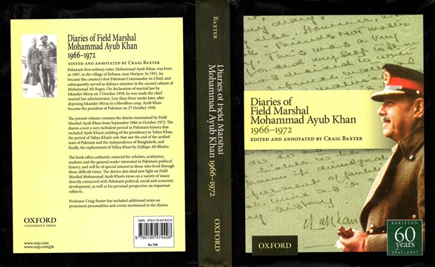 Diaries of Field Marshal Mohammad Ayub Khan, 1966-1972 edited and annotated by Craig Baxter, contains the entries of diaries maintained by Field Marshal Ayub Khan from September 1966 to November 1972. The diaries cover a very turbulent period in Pakistan's history — Ayub Khan's yielding power to Yahya Khan and his rule over united Pakistan, 1971 Pakistan-India war leading to the creation of Bangladesh, and finally, power transfer from Yahya Khan to Zulfiqar Ali Bhutto. The editor has included notes on personalities and events mentioned in the diaries.