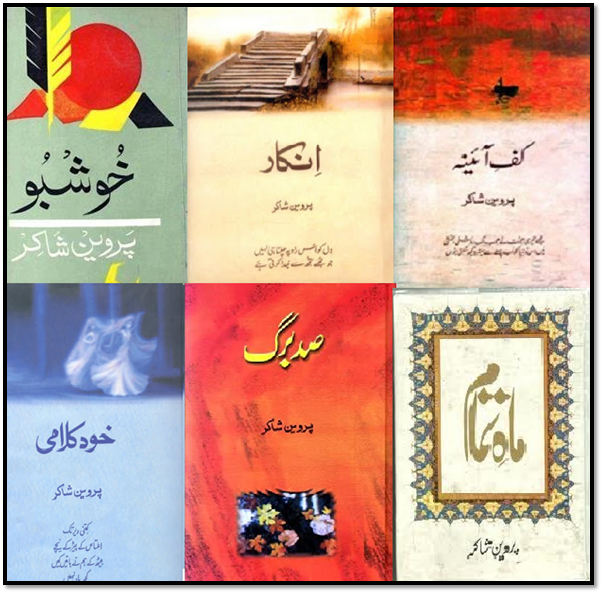 Parveen Shakir started her poetic journey while attending Sir Syed College where dedicated professors instilled in her strong foundations of literary skills; she initially used the pen name of Beena, and later changed it to Perveen. Her poetic and prose works were published in Urdu and English newspapers. She also participated in various literary programs at Radio Pakistan and Pakistan Television (PTV). Her poetic collections include Khusboo (Fragrance:1977), Sadburg (Marsh Marigold:1980), Khud Kalaami (Talking to self:1985), Inkaar (Denial: 1990), Mah-e-Tamaam (Full Moon:1994). Her collection of work based on her diaries was published as Kaf-e-Aaina (Edge of Mirror), and her collection of newspaper columns was published as Gosh-e-Chashm (Nook of Sight).