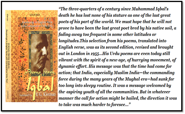 In the preface of the 1955 edition, referring to Iqbal’s work, Kiernan observes: “Apart from a handful of Persian poems the verse chosen here for translation is taken from Iqbal's work in Urdu, which consists of short and medium-length pieces only. The selection extends over the whole of his working life, and may serve to illustrate its main phases; it includes a good proportion of those poems that have been most admired by the judicious. …In Urdu, lqbal is allowed to have been far the greatest poet of this century, and by most critics to be the only equal of Ghalib (1797-1869). He was the first prominent Urdu poet who was a native of the Punjab, and his emergence marked a shift of Muslim Indian culture away from the Deccan and the United Provinces towards the north. In Persian, in which he published six volumes of mainly long poems between 1915 and 1936, his rank is less easy to determine…. Iqbal, like Shakespeare or Goethe in other modes and degrees, belonged to a stage in which society had begun but not yet finished crystallizing into exclusive sections, and emotion had not yet fully crystallized into thought. Iqbal hated injustice; his protest, first made in the name of India, continued in the name of Islam; in this form it was reinforced, rather than superseded, by a protest in the name of the common man, the disinherited of all lands...” The following renderings of selected poems of Iqbal represent Kiernan’s craft: