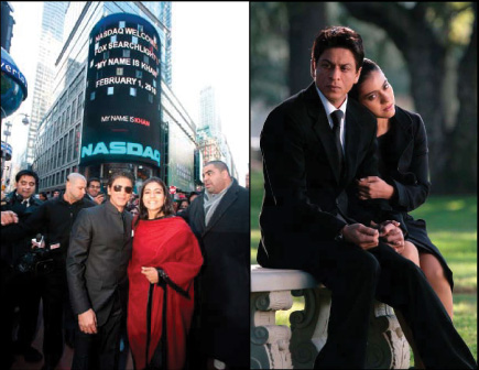 Shahrukh Khan and Kajol at the NASDAQ bell-ringing ceremony (left) and in a scene from the film (right)