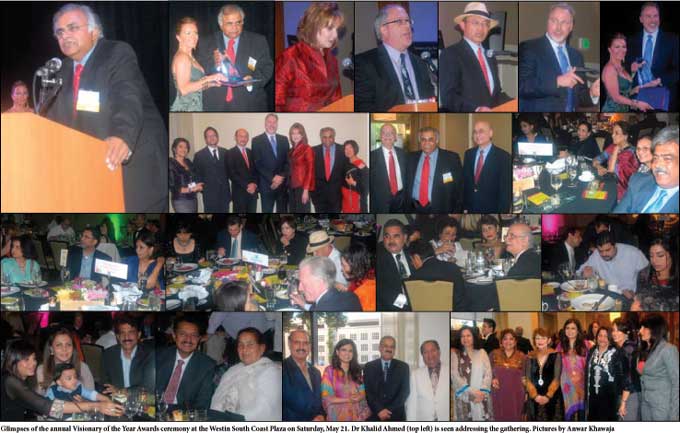 Among the six 2011 Visionary of the Year Award honorees was a distinguished Pakistani-American, Dr. Khalid Ahmed, an orthopedic surgeon with practices throughout Southern California. Dr. Ahmed is involved in many charitable and philanthropic causes and has contributed generously to education, particularly for women in Pakistan, and to the various philanthropies in America.