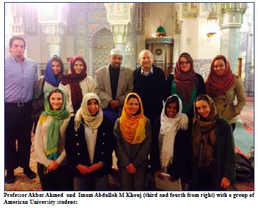 The visit was scheduled to give students, from Professor Ahmed’s popular World of Islam class at American University, an experience of a mosque and to clear misperceptions about clashes of faiths. We chose to visit the Islamic Center in DC, a mosque designed by an Italian architect and constructed in the fifties. The Imam at the Center led us through the prayers and explained the three categories in Islam - a Muslim, who may or may not be truly spiritual; a Momim, a believer who practices his belief faithfully; and the highest category of a Muhsin, who is benevolent, charitable and a humanitarian to all mankind. For him, spreading education or ilm met with the highest category - a reason why he often addressed Professor Akbar Ahmed as Muhsin. Imam Abdullah M Khouj, who is from Mecca, became a Hafiz, or someone who memorizes the entire Qur'an, at the age of 11. He clearly held high reverence for scholarship and service, perhaps even greater than just practicing beliefs.