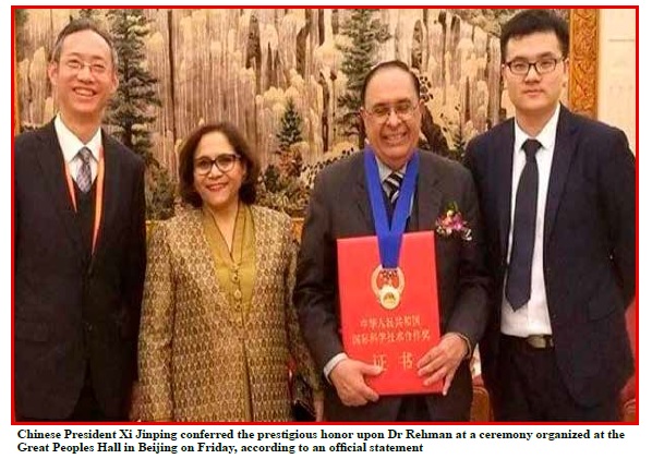 The President of China, Xi Jinping, has conferred the highest scientific award of China on the famous Pakistani scientist Professor Dr Atta-ur-Rahman in the Great Peoples Hall in Beijing. Professor Atta-ur-Rahman is the only Muslim scientist who has been honored with this prestigious award, "China International Science and Technology Cooperation Award."