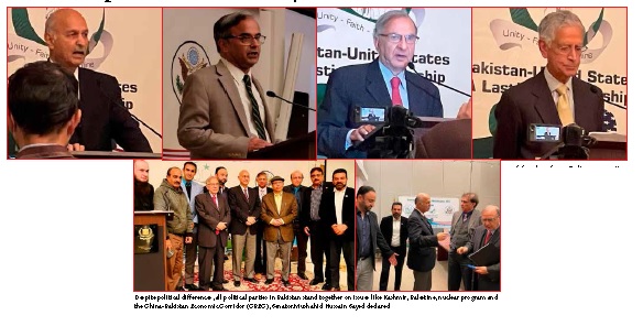 Washington, DC: Senator Mushahid Hussain Sayed, Chairman, Pakistan Senate’s Defense Committee and the keynote speaker at an event organized by the Pakistan Embassy in Washington, DC said that despite political differences, all political parties in Pakistan stand together on issues like Kashmir, Palestine, nuclear program and the China-Pakistan Economic Corridor (CPEC). Showing complete unity in the Senate of Pakistan, lawmakers on both sides of the aisle have called for moving relevant courts for war crimes against the Indian premier for the genocide of Kashmiris and urged the world community to take notice of the same.