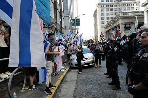 San Francisco: Outside of the Israeli Consulate on October 8 in the aftermath of the Hamas rocket and missile attack on Israel, a hastily called pro-Palestinian rally, “All Out for Palestine” saw pro-Israeli counter demonstrators square off under a heavy riot police presence hurling insults and accusations at each other as they chanted and yelled in support of their separate causes.
