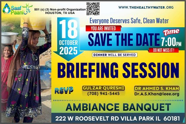 Saaf Paani is hosting briefing sessions nationwide, with the next event scheduled in the Chicago area on October 18, 2025. Everyone is encouraged to spread the word and support this noble cause. For more information, visit: www.thehealthywater.org.