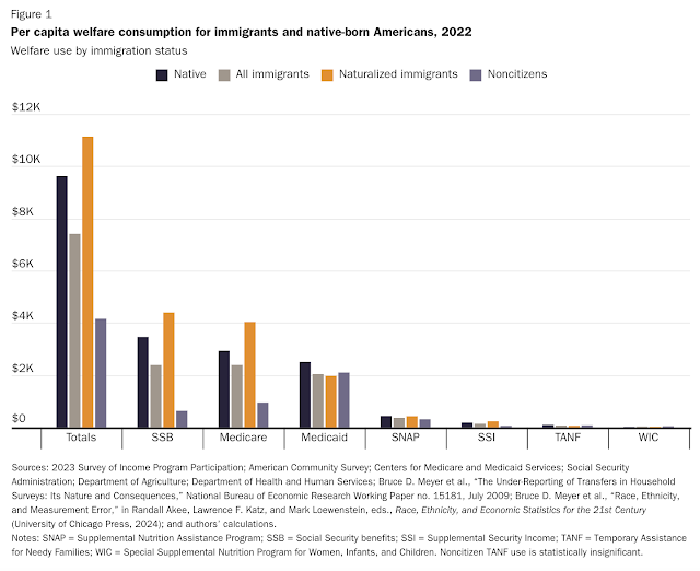 President Trump's post is part of his larger anti-immigration theme to please his MAGA base. But a Cato Institute study found that all immigrants consumed 21% less welfare and entitlement benefits than native-born Americans on a per capita basis in 2022, based on data from the Survey of Income and Program Participation (SIPP). Immigrants were 14.3% of the US population and consumed just 11.9% of all means-tested welfare and entitlement benefits that year. Here's an excerpt from the Cato study: